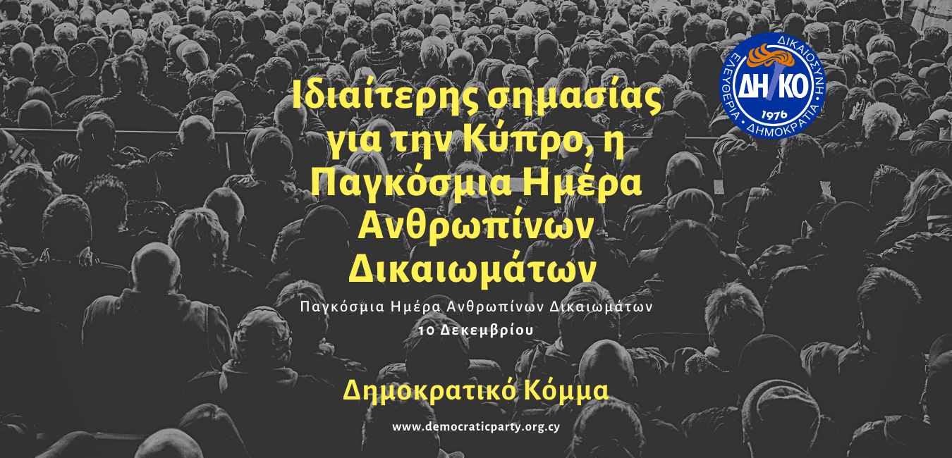 Το Δημοκρατικό Κόμμα τιμά την Παγκόσμια Ημέρα Ανθρωπίνων Δικαιωμάτων, διακηρύσσοντας ότι δεν θα σταματήσει να αγωνίζεται για την εξεύρεση λύσης στο κυπριακό, που να διασφαλίζει τον έμπρακτο σεβασμό των ανθρωπίνων δικαιωμάτων και να εξαναγκάζει την Τουρκία, ν’ αποσύρει τα στρατεύματα κατοχής, να σταματήσει τον εποικισμό και να σεβαστεί τις βασικές ελευθερίες, διακίνησης, εγκατάστασης και απόκτησης περιουσίας.