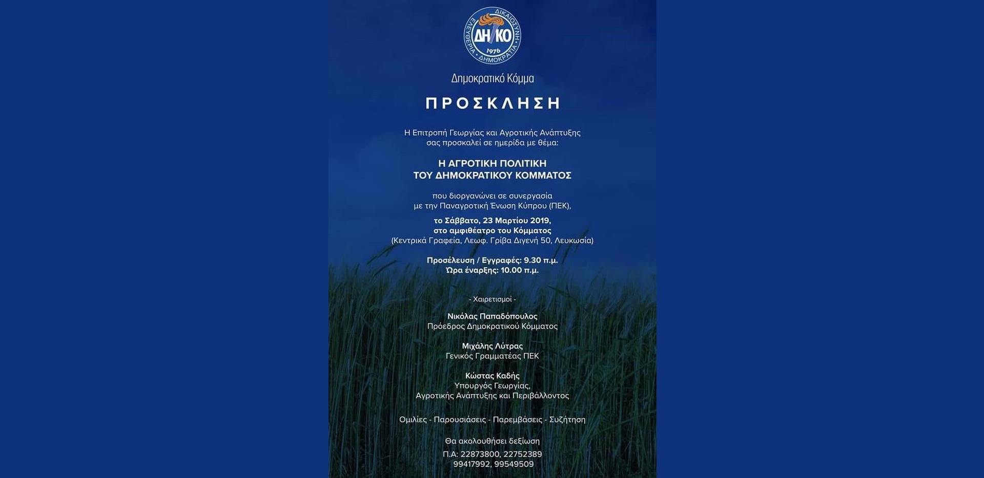 Η Επιτροπή Γεωργίας και Αγροτικής Ανάπτυξης του Δημοκρατικού Κόμματος, σε συνεργασία με την Παναγροτική Ένωση Κύπρου (ΠΕΚ), διοργανώνει ημερίδα με θέμα «Η αγροτική πολιτική του Δημοκρατικού Κόμματος», το Σάββατο, 23 Μαρτίου 2019, στις 10:00 π.μ., στο αμφιθέατρο των κεντρικών γραφείων του Δημοκρατικού Κόμματος.