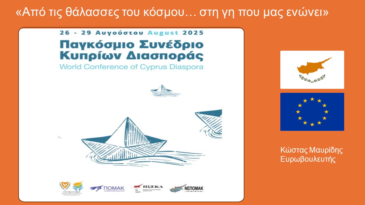 Στο περιθώριο του Παγκόσμιου Συνεδρίου Κυπρίων Διασποράς το οποίο διεξάγεται στη Λευκωσία με σύνθημα «Από τις θάλασσες του κόσμου… στη γη που μας ενώνει» και συγκεκριμένα στις εργασίες της ΠΣΕΚΑ (Παγκόσμια Συντονιστική Επιτροπή Κυπριακού Αγώνα), ο Ευρωβουλευτής Κώστας Μαυρίδης (ΔΗΚΟ – S&D) παρουσίασε το θέμα «Παράνομος Εποικισμός: Διεθνές Ποινικό Δικαστήριο (ΔΠΔ) και πολιτικές προεκτάσεις.»