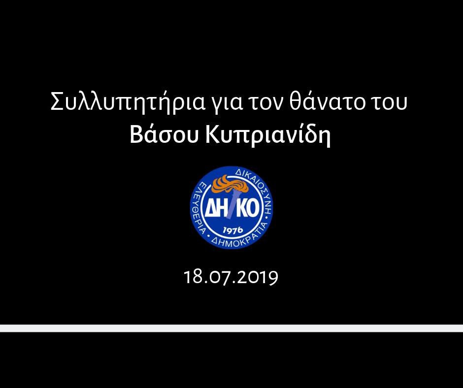 Τα στελέχη, το προσωπικό και τα μέλη του Δημοκρατικού Κόμματος εκφράζουν τη βαθιά τους θλίψη για το θάνατο του Βάσου Κυπριανίδη, πατέρα της κυρίας Γιώτας Παπαδοπούλου, συζύγου του Προέδρου του Δημοκρατικού Κόμματος, Νικόλα Παπαδόπουλου.